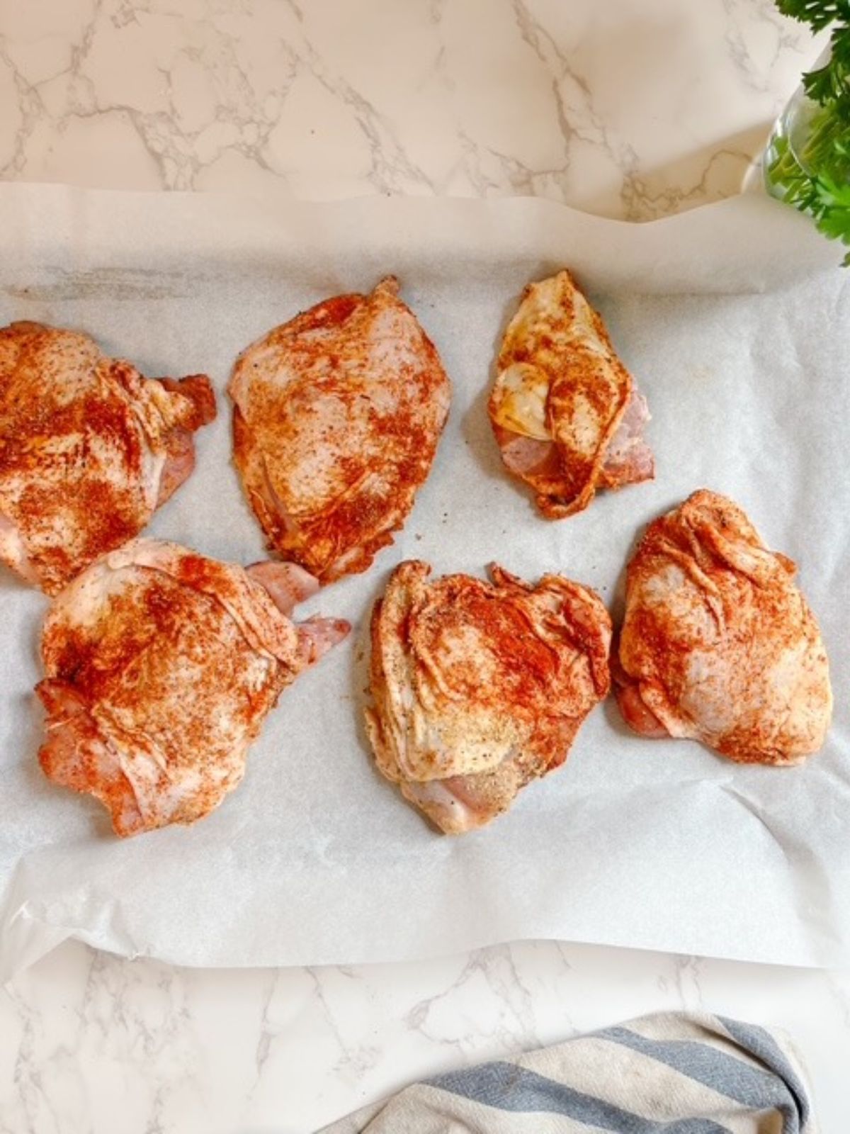 - Place the seasoned chicken thighs on the parchment lined baking sheet. Being sure to leave space between each one to also help crisp up the skins.