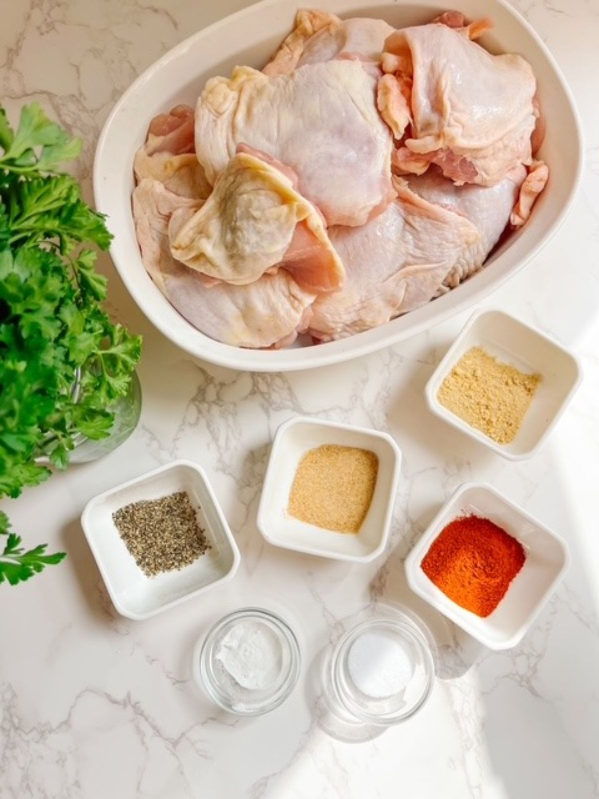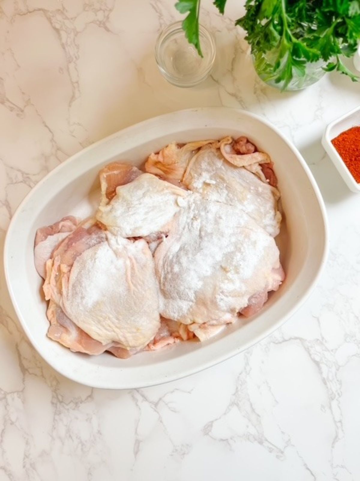 - Then, measure out the seasonings and sprinkle them on the thighs. Use your hands or a spoon to make sure all the seasoning gets on the chicken.