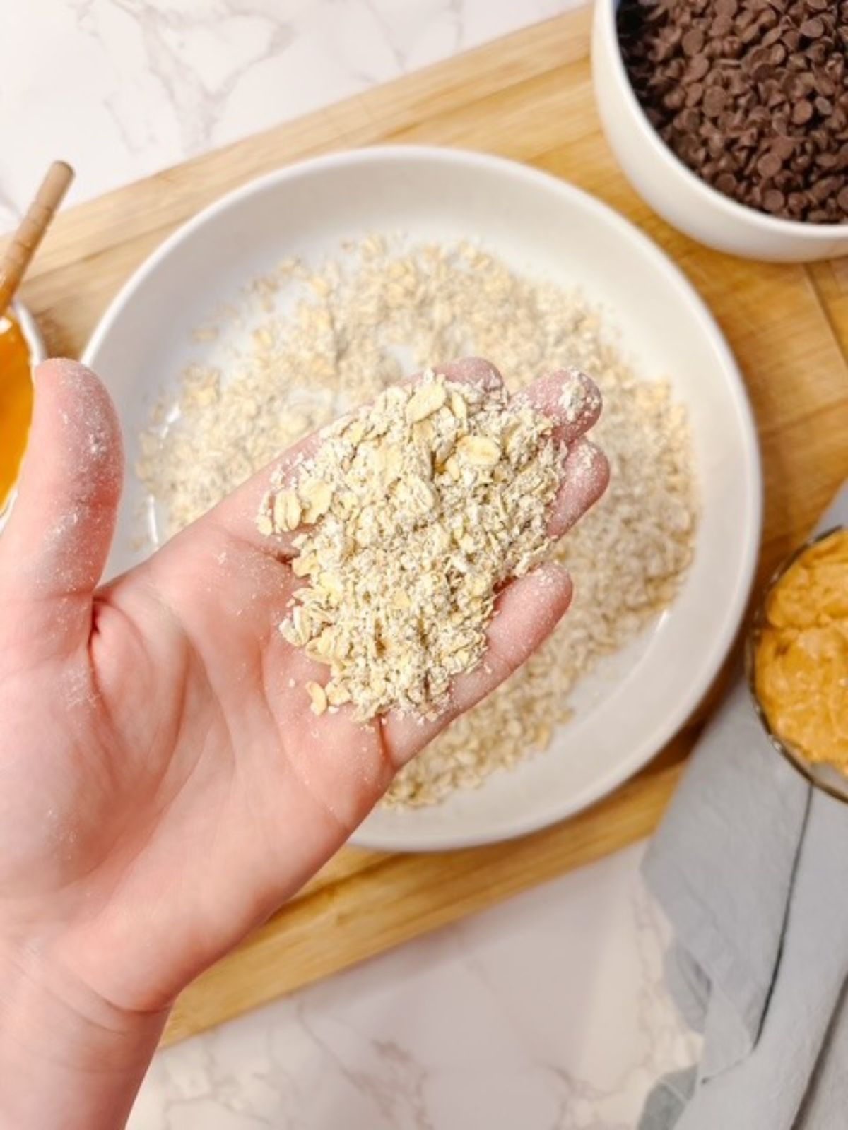 Start by pulsating the rolled oats in a blender until slightly finer. This will help them be a little smoother.