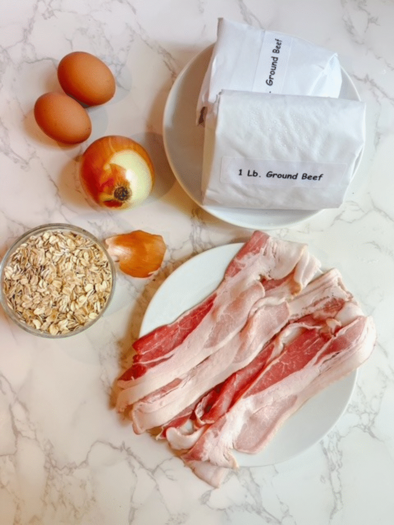 - To start, in a large mixing bowl, add in all of the ingredients except this bacon - 2 pounds ground beef, 1 diced yellow onion, 2 eggs, 1 cup oats, 1 teaspoon garlic powder, 1 teaspoon onion powder, 1 teaspoon salt, 1 teaspoon pepper. Mix until fully combined into one.