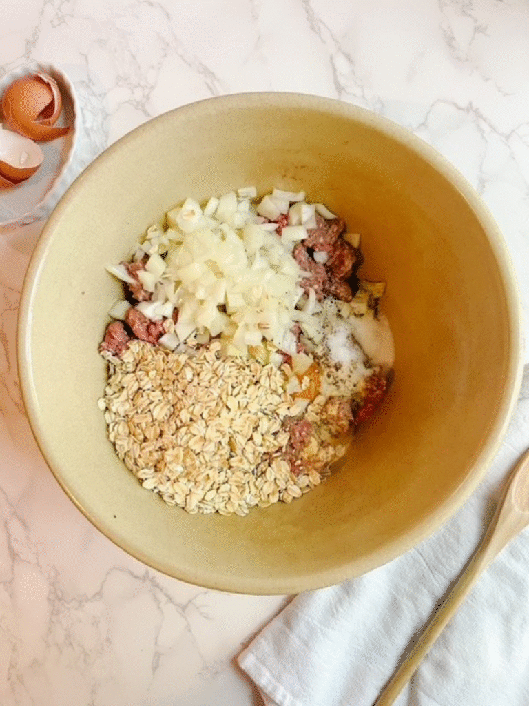 To start, in a large mixing bowl, add in all of the ingredients - ground beef, eggs, oats, diced onion, and spices. The only thing we aren't adding in right now is the bacon. Mix that well until all ingredients are incorporated into one.