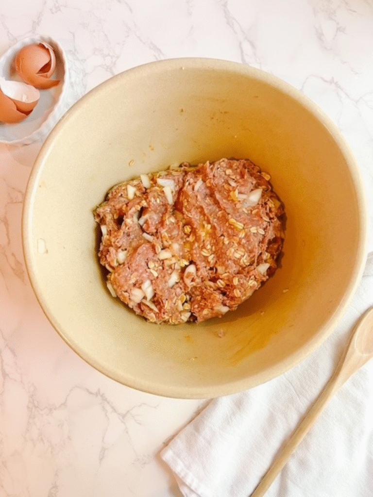 - In a baking dish, form the meat mixture into a loaf shape. Distributing the meat evenly so it bakes evenly throughout.