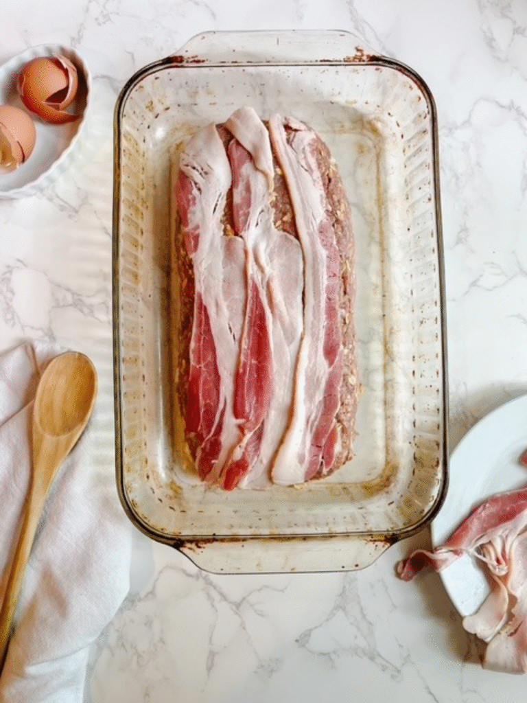 Add the slices of bacon longways on the meatloaf. Covering the top and the sides.