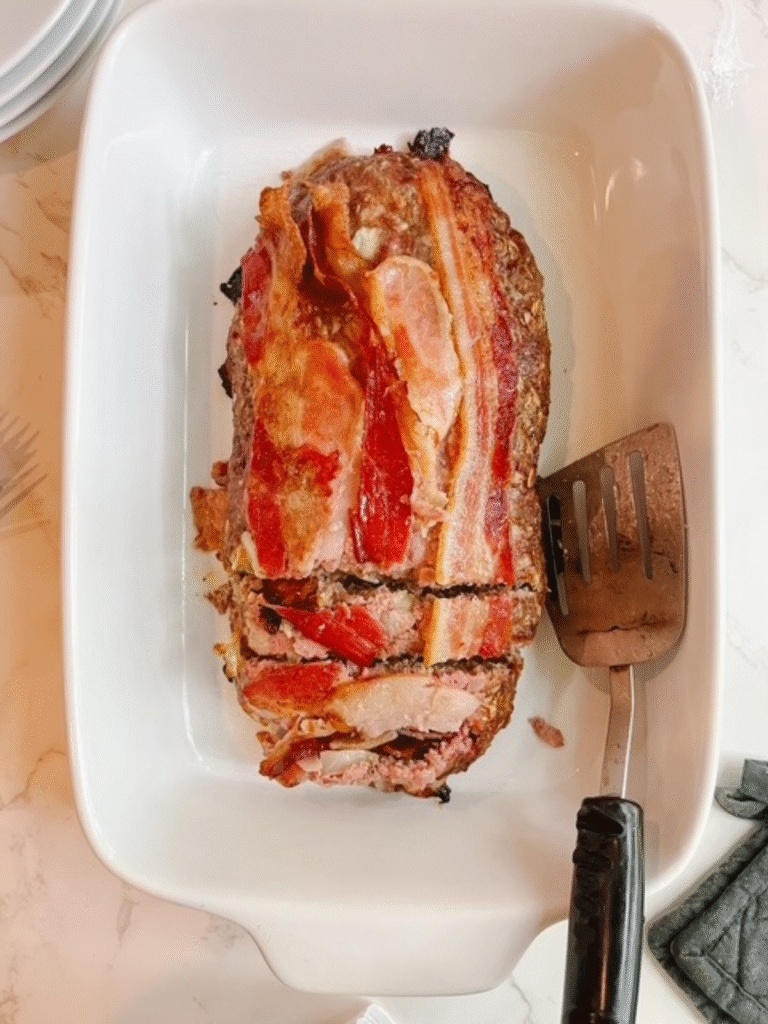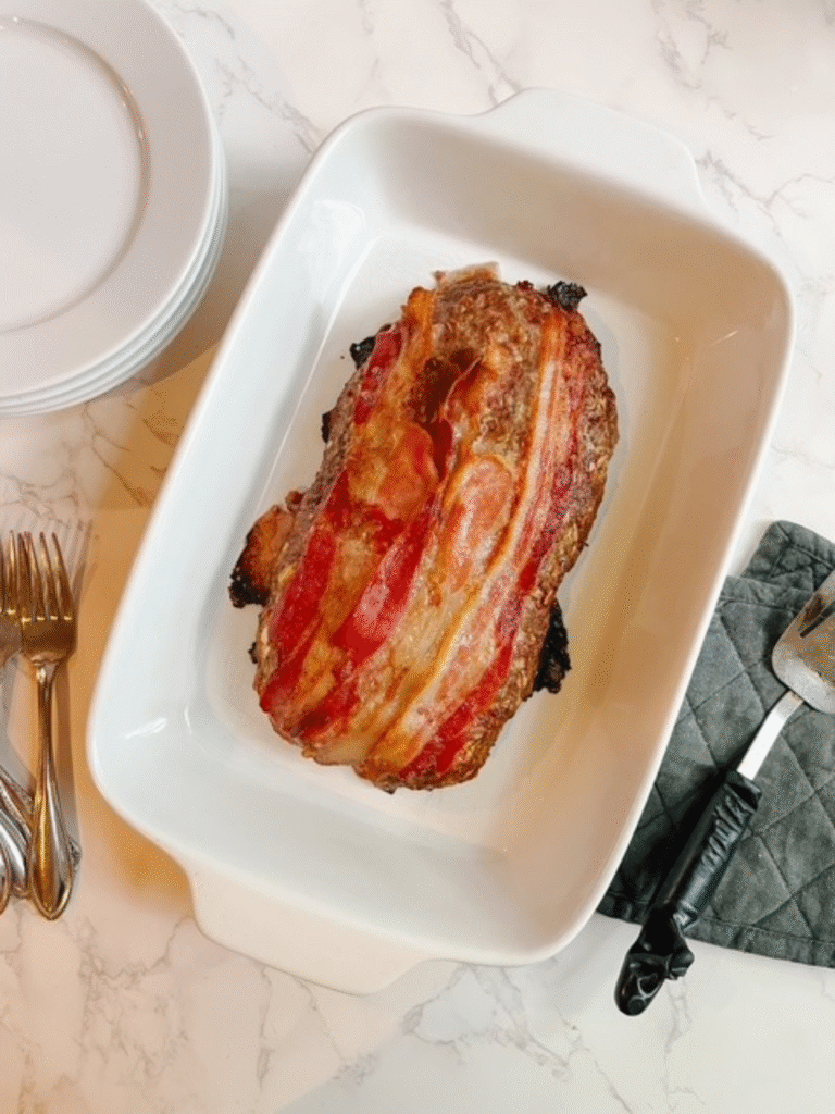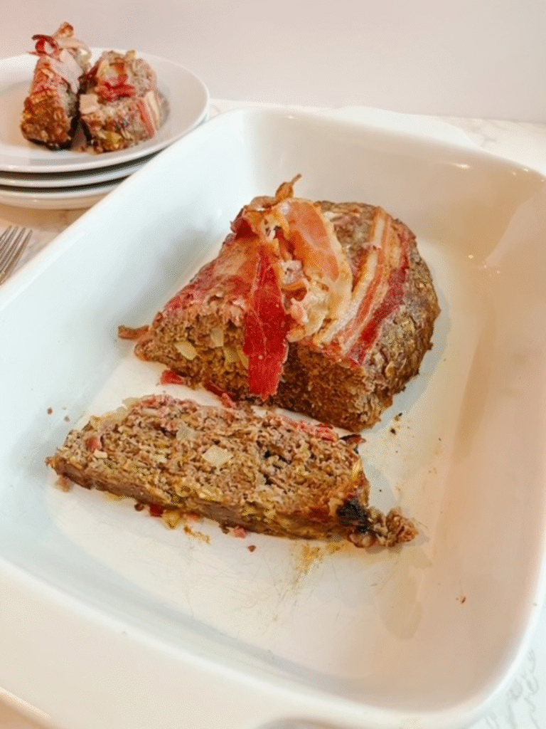 This bacon meatloaf is juicy and full of flavor! It is made with simple ingredients that you most likely already have around your home. This bacon meatloaf will be a crowd pleaser!