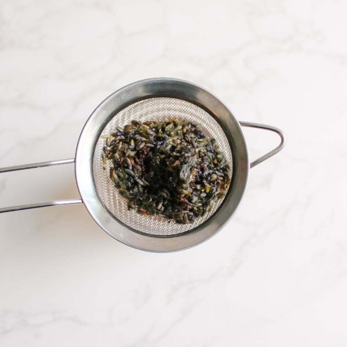 - Once those 15-30 minutes are up, run the simple syrup through a fine mesh strainer to remove the culinary lavender.