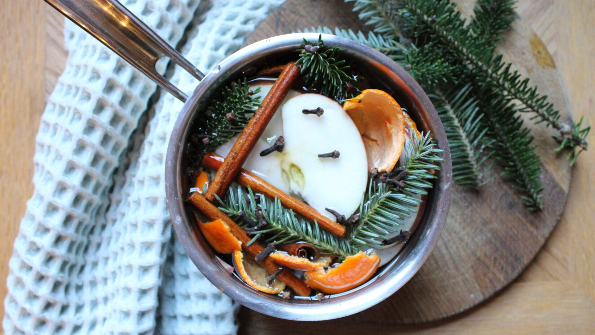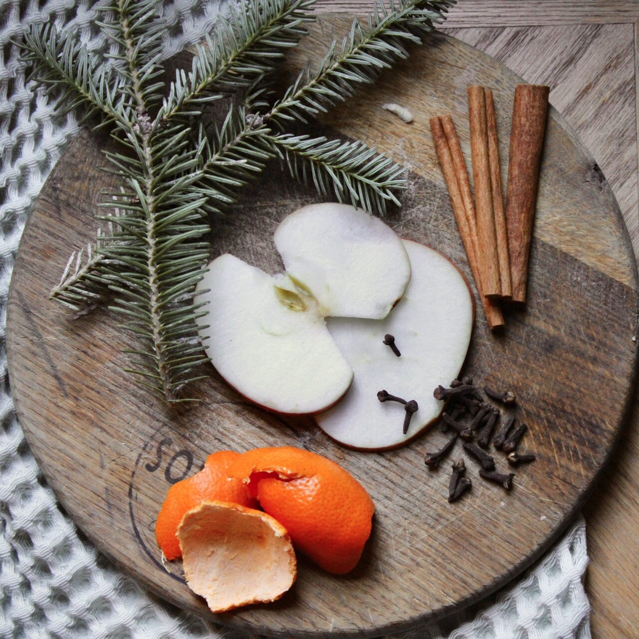 First, gather your ingredients. Here, you can see that I use whole cloves, cinnamon sticks, orange peels, fresh apple slices, vanilla as well as fresh pine clippings.